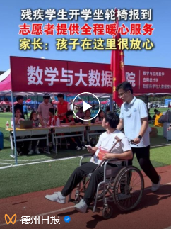 德州学院新生王志芳,从小因脑部运动神经受损导致行动不便,只能与轮椅为件。9月6日报道时学校老师同学全程提供暖心服务。