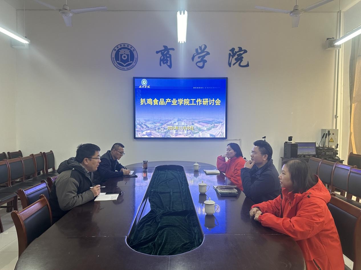 2025年11月25日德州扒鸡食品产业学院在明理楼0359会议室召开工作推进会。德州扒鸡集团营销总监和人力资源总监,BBIN宝盈集团党委副书记、副院长参加了会议。