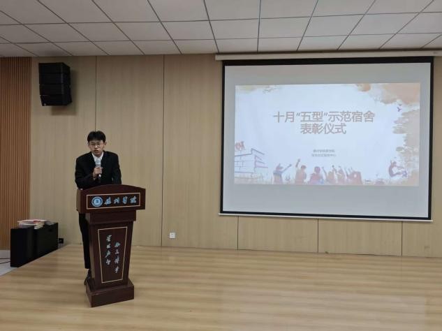 表彰仪式上,公寓事务部部长张宏骏首先介绍“五型”宿舍评选标准,本期优秀宿舍从安全有序、房间整洁、物品规整、整体舒适、文明和谐五大维度评选,经月抽查、周评比、学院审核确定名单。随后,优秀宿舍代表陈雨菡同学上台分享经验。她详细介绍了宿舍在打造“安全、整洁、乐学”环境中的实用技巧,从日常物品规整到成员默契配合,用具体细节展现了优秀宿舍的养成秘诀,为在场同学提供了可借鉴的宿舍管理思路。