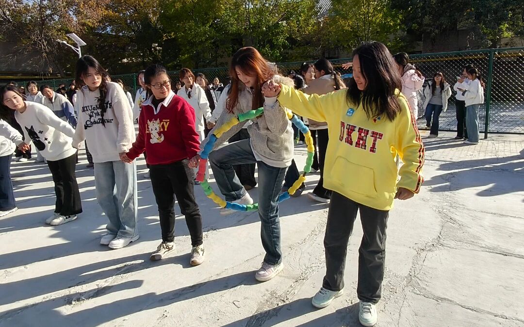 开场哨声一响,各赛场秒变竞技场!"一圈到底"要求每队10人小手紧牵,光靠身体扭动让呼啦圈在队员间穿梭。裁判令下,同学们或侧身闪转,或灵巧转身,呼啦圈在欢声笑语中飞速传递。当呼啦圈完整回到起点那刻,全场炸响欢呼,新生们的距离感"咻"地消失不见。
