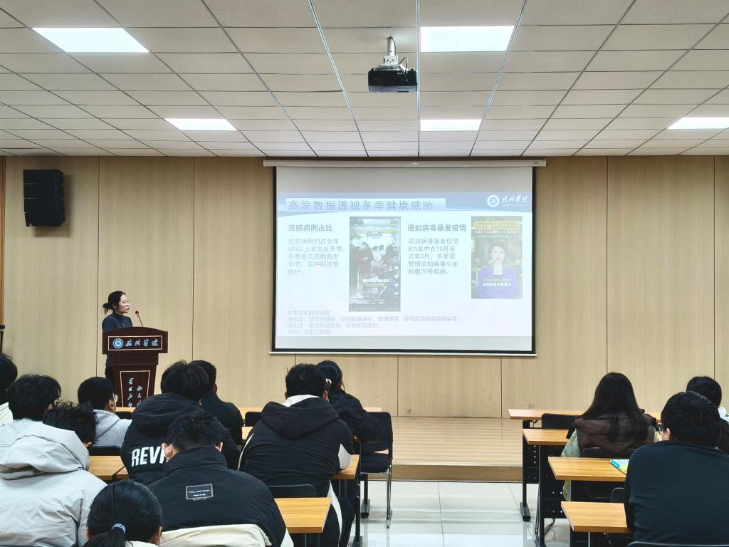 讲座中,郑老师结合冬季气温波动大、呼吸道传染病以及流感高发的特点,详细讲解了流感等常见传染病的传播途径、典型症状及预防措施。随后,郑老师聚焦传染病防控的核心要点,通过现场演示与互动问答的形式,有针对性地解答同学们日常防护中的困惑。刘书记提醒同学们,需养成良好个人卫生习惯,做到合理作息、均衡营养,切实提升自身免疫力,共同守护健康安全的校园环境。